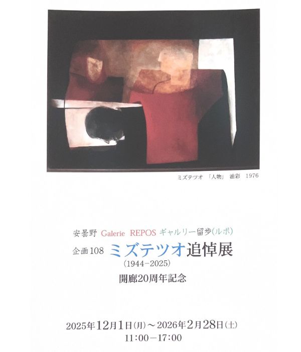 A memorial exhibition for Mizu Tetsuo will be held at Galerie Rupo in Azumino.